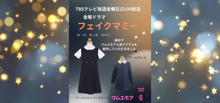 2025年12月:TBSテレビ 金曜ドラマ「フェイク・マミー」でマムエモアの女児ジャンパースカート、ジャケット、婦人スーツ、各種小物類を商品協力させていただきました